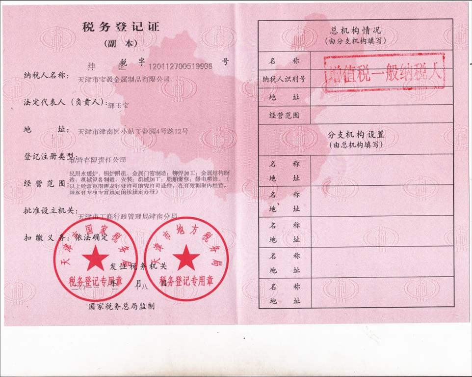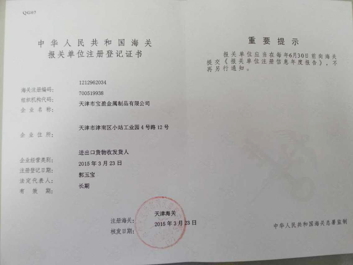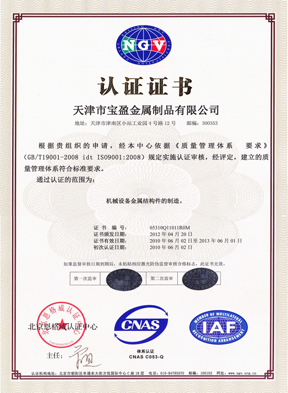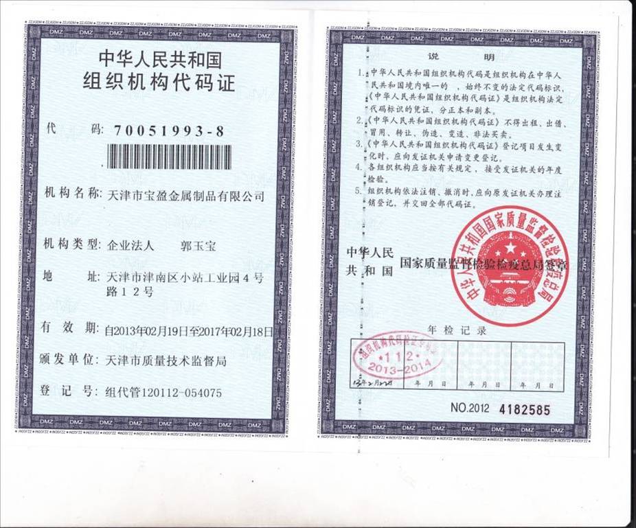 天津市寶盈金屬制品有限公司成立于1998年,公司坐落于天津市津南區(qū)小站工業(yè)園。距津港高速公路2公里,塘沽港25公里,天津?yàn)I海國(guó)際機(jī)場(chǎng)25公里,海、陸、空交通十分便利。公司占地面積10000平方米,年生產(chǎn)能力4500噸金屬制品,包括辦公室人員及車(chē)間工人寶盈共有100多名員工。 2010年6月2日,通過(guò)了ISO9001:2008質(zhì)量管理體系認(rèn)證,2012年5月由摩迪國(guó)際進(jìn)行焊工考試,取得EN 287-1焊工資格證書(shū)。